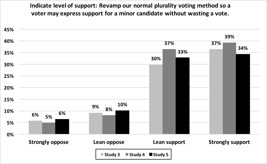 For the last three studies, we asked the participants to express their level of support for the statement “Revamp our normal plurality voting method so a voter may express support for a minor candidate without wasting a vote.” Support for revamping the current voting system in studies 3 through 5 were 67%, 76%, and 67%, respectively.