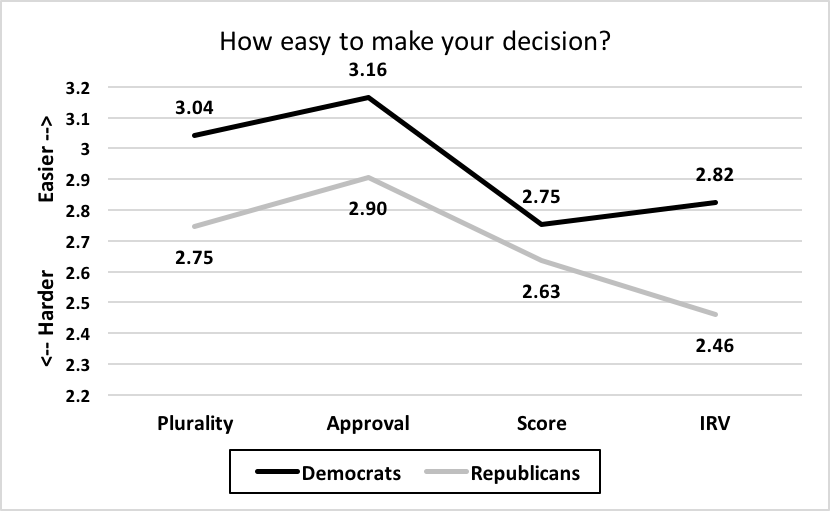 Looking at the average ease of voting in broad strokes, without considering standard error, approval voting was rated the easiest voting system by both Republicans and Democrats, IRV was rated the least easy for Republicans, and score voting was rated the least easy for Democrats.